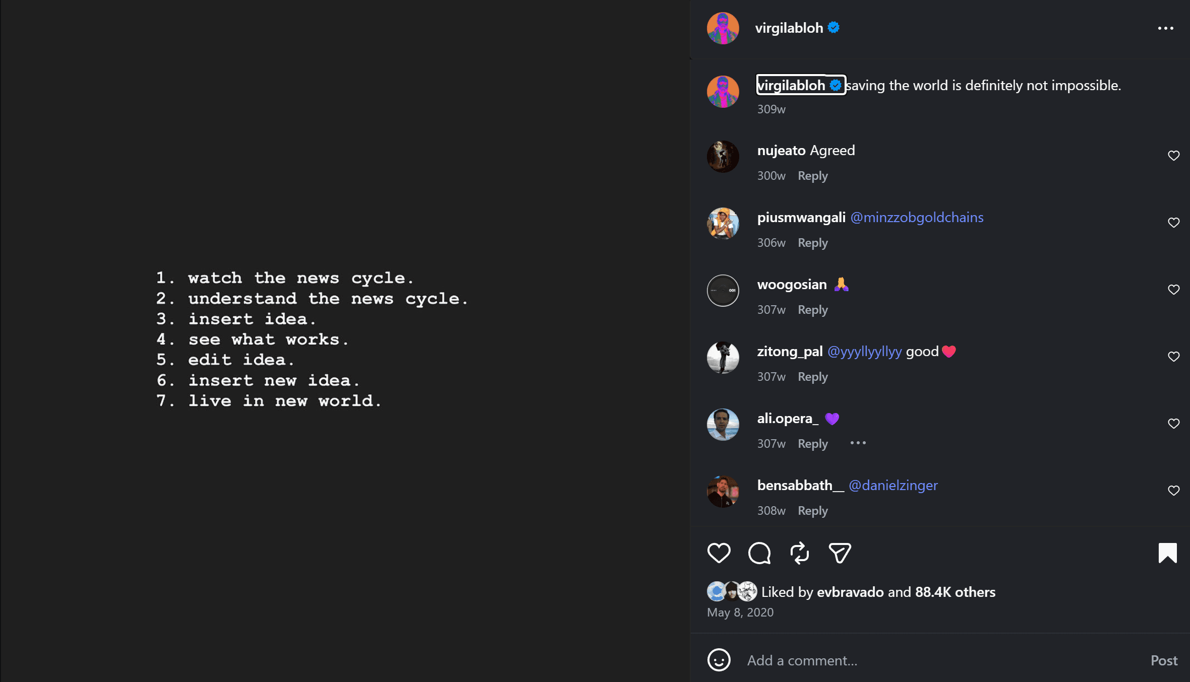 I think Virgil Abloh touched on this overall feedback loop at the end of his lecture “Insert Complicated Title Here” and on his Instagram: