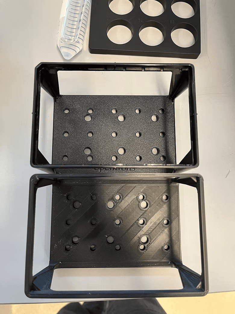 This project started when a cattle mastitis testing company reached out to me. They focused on testing dairy samples for pathogens that cause mastitis, and used industrial pipette machines requiring proprietary equipment that had gone out of production. My role was to design a chemically stable and durable set of test tube racks for their machine to reduce the cost of buying second-hand racks for $500+. Through photos and diagrams, I was able to recreate the racks within two iterations through Fusion360 and 3D printing. See the photos below: