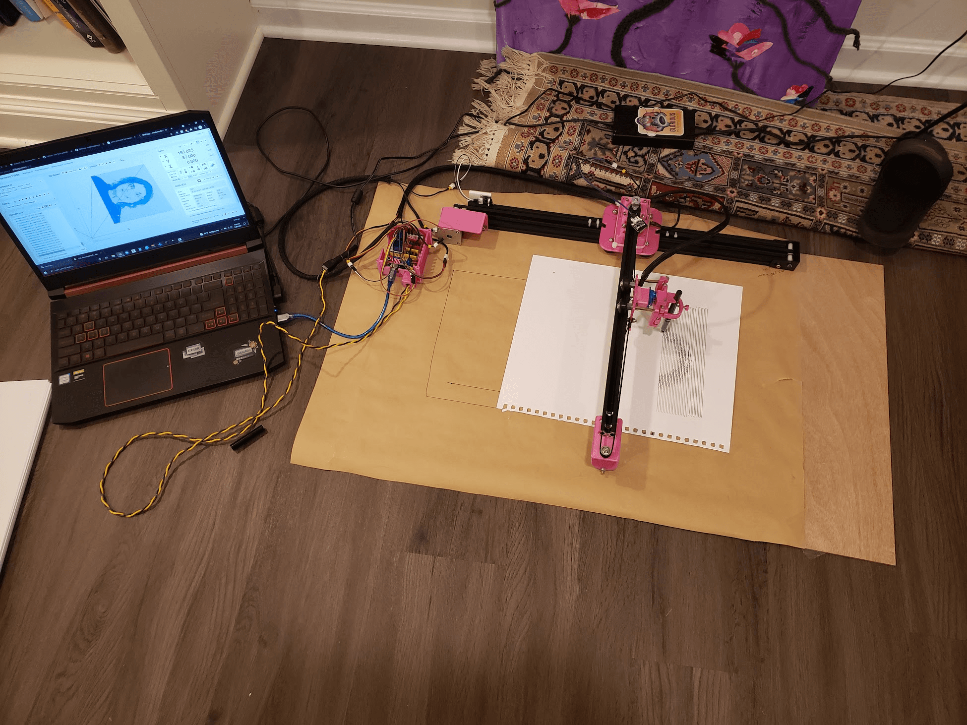 My freshman year of Highschool, I began working on converting scrap 3D printer parts and extrusion from my VZBot build into a pen plotter. I designed hot-pink 3D printed parts and programmed Nema-17 motors to move the gantry with a custom firmware.